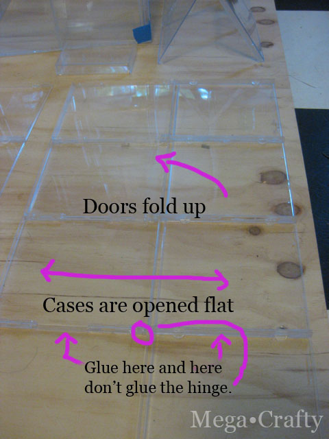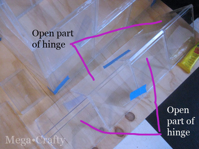 Before glueing anything lay the cases out and decide if the hinges are going to be on the left or the right. And remember the open space near the hinge I mentioned? Make sure on each case that open space faces down, that way you’ll have one side of each wall that’s smooth solid plastic.